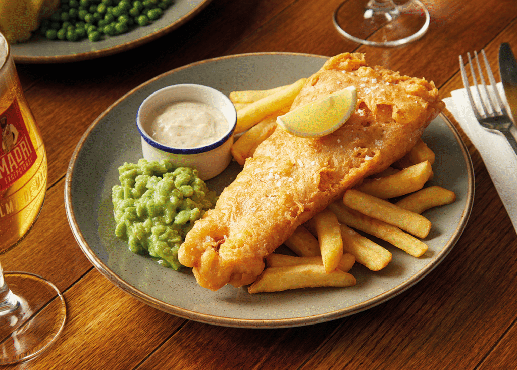 Hand-battered fish & chips, hand-battered fish fingers, served with chips and peas (†) | 3.99 712 kcals