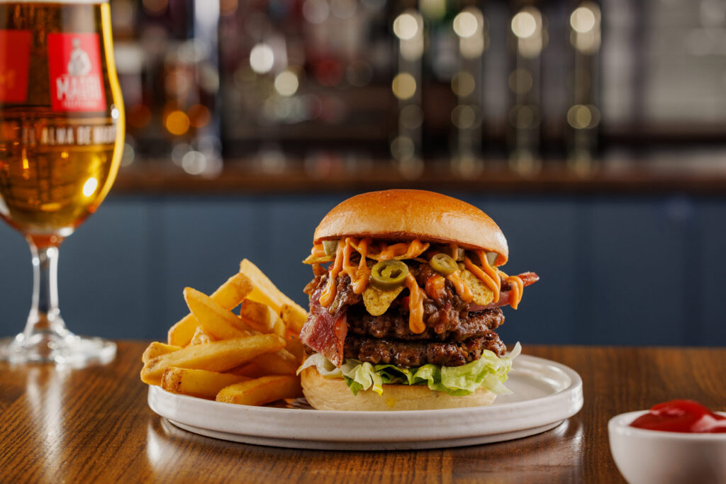 Classic burger, two 3oz beef patties with burger sauce. Served in a toasted brioche-style bun with chips | 10.99 1378 kcals