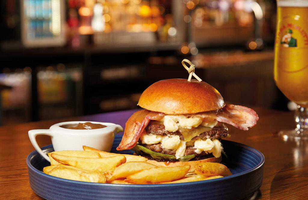 3oz cheese burger, 3oz beef patty, smoked cheese and burger sauce in a toasted brioche-style bun, with skin-on chips | 7.29 1177 kcals