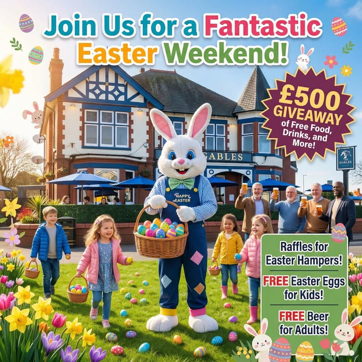 🌟 Weekend Recap & Easter Excitement! 🌟 Get ready for a fantastic weekend filled with fun and festivities! 🎉 Also remember, it’s our 1-year birthday of running The Gables! Andy and Ryan would love for you to come down so they can personally thank you for all the support you’ve given them over this past year! 🎟️ Easter Hamper Ticket Sales: Grab your tickets for our Easter hampers at just £1 a strip, available at the bar! 🎡 Spin the Wheel: Buy a Spin the Wheel ticket and if it lands on “Spin Again,” you’ll snag a free cream egg! 🍫 🐰 Giveaways: Join us from 2PM today as we give out free bottled beer or cider, plus envelopes with food prizes! Remember, the lucky person who finds 21RC will win a £20 bar tab to be redeemed on the day. 🥚 Easter Sunday Treats: We’ll be giving out free Easter eggs to any parent visiting with their child on Easter Sunday! 💖 Charity Support: We’re also donating 10p from every pint sold this weekend to charity, split between Alder Hey and Rainbow Hub. We have two charity buckets set up, and we encourage everyone to donate! Note: All items are subject to stock—when they’re gone, they’re gone! Let’s make this weekend unforgettable! 🎉🍻✨ #EasterCelebration #TheGables #CharitySupport #BirthdayBash #SpinTheWheel #EasterHampers #CommunityLove #SupportLocal #ProudToBeLocal