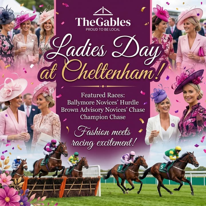 🏇 DAY 2 - LADIES DAY 🏇 The glamour and excitement continues! Ladies Day at Cheltenham - where fashion meets racing thrills! 👒 Ryan’s Picks: 💚 No Drama This End 5/1 - Turner's Novices' Hurdle (1.20pm) 💚 Final Demand 11/2 - Brown Advisory Novices’ Chase (2pm) 💚 Captian Guinness 50/1 - Champion Chase (4pm) 📋 BETTING SLIPS AVAILABLE AT THE BAR! Dress to impress and join us for an unforgettable day of racing. Watch live on our screens, place your bets right here at the bar, and the bookies is just 2 minutes away! Why not join us and chance your luck on the odd bet or two? 🍻 👇 Ladies - will you be joining us Today? #CheltenhamFestival #LadiesDay #Cheltenham2026 #HorseRacing #TheGables #FashionAndRacing